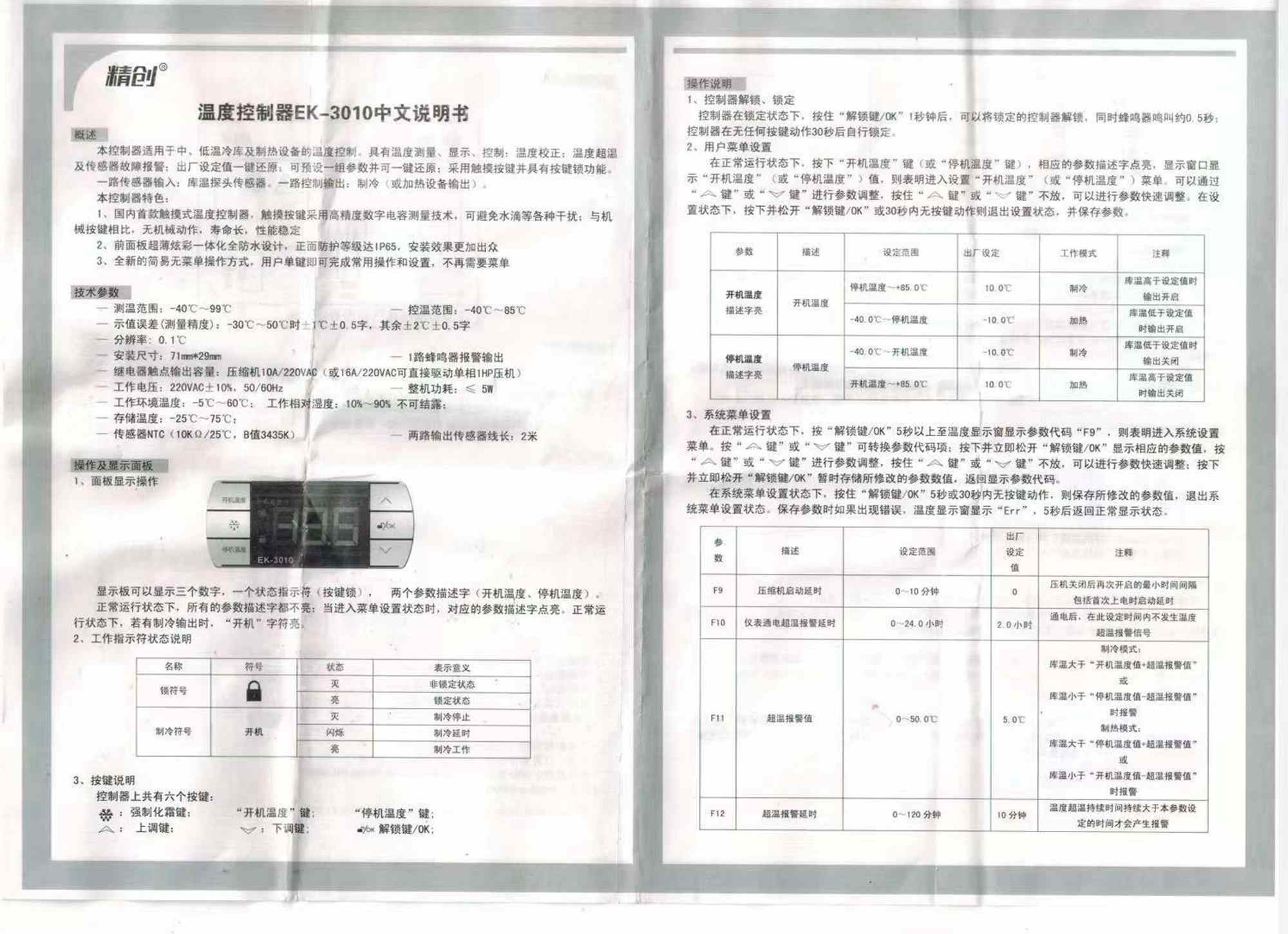溫控器-精創-EK-3010說明書 、 精巧、精度高、性能穩定、觸摸按鍵。
